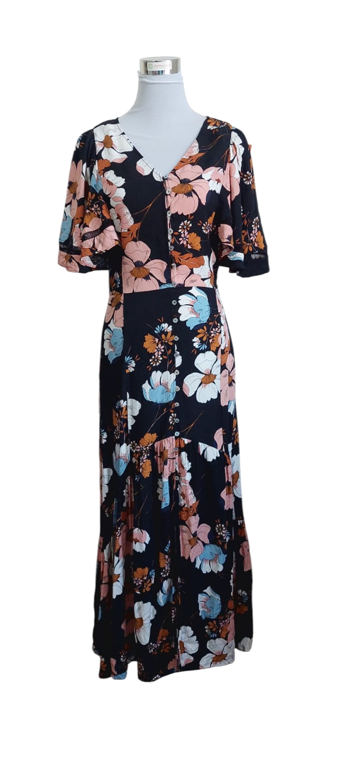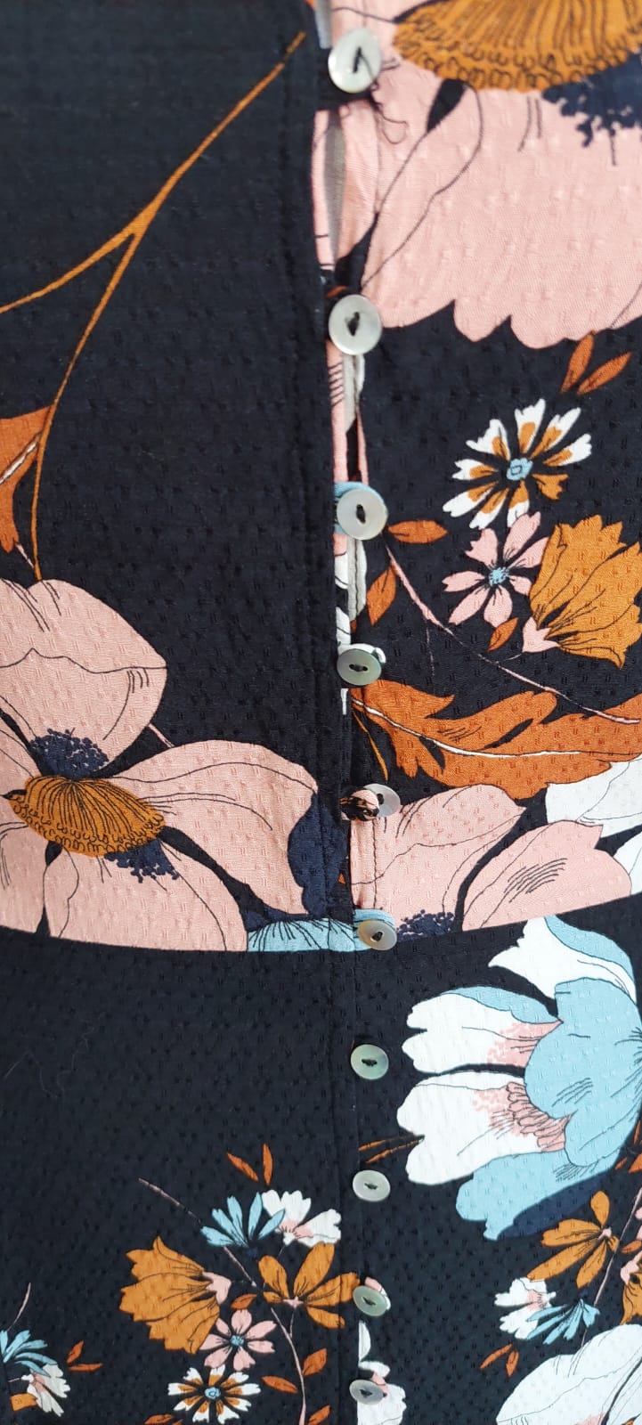 Hermoso vestido en talla S de algodón con viscosa . Modelo abotonado en la parte superior con mangas japonesas .Modelo en Corte A.