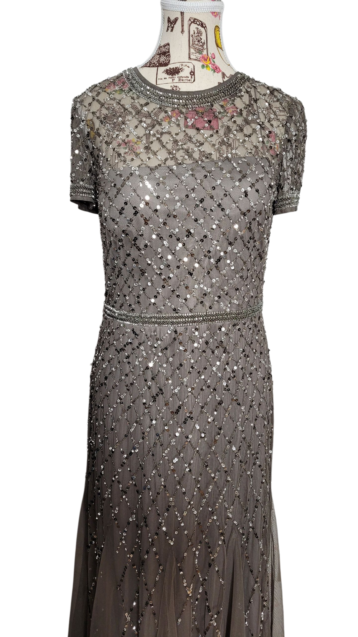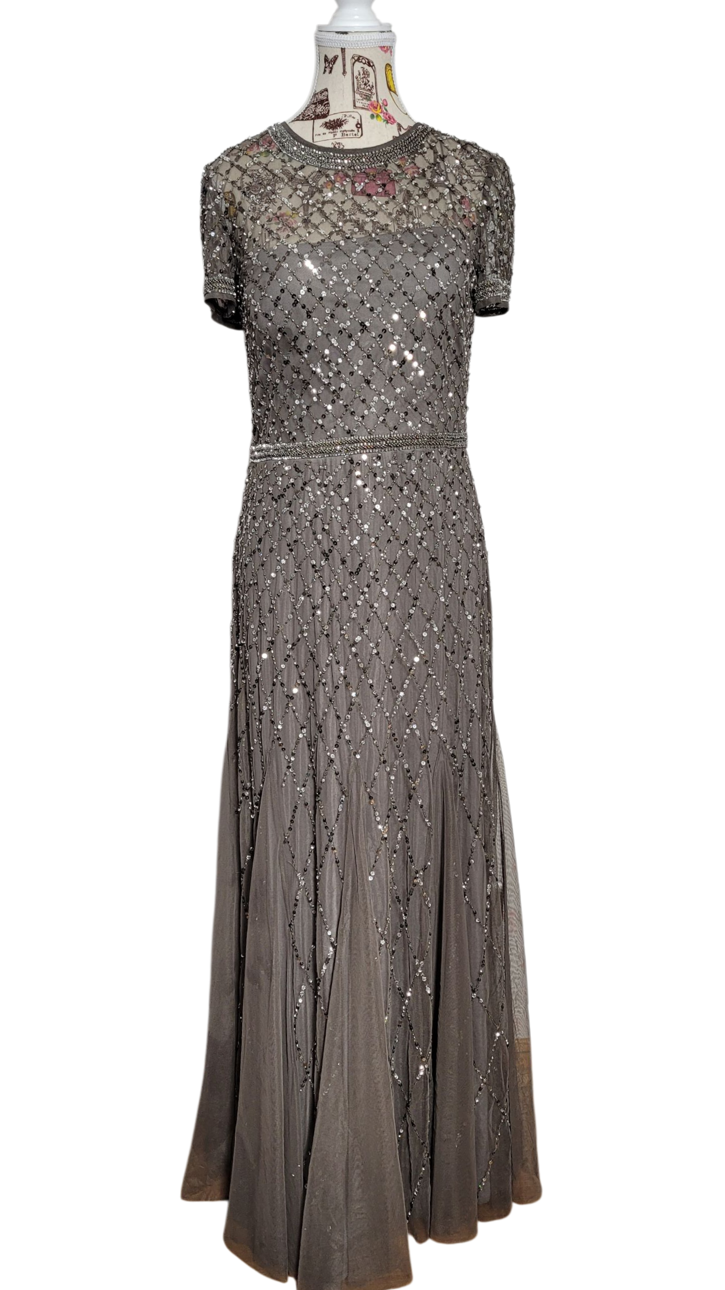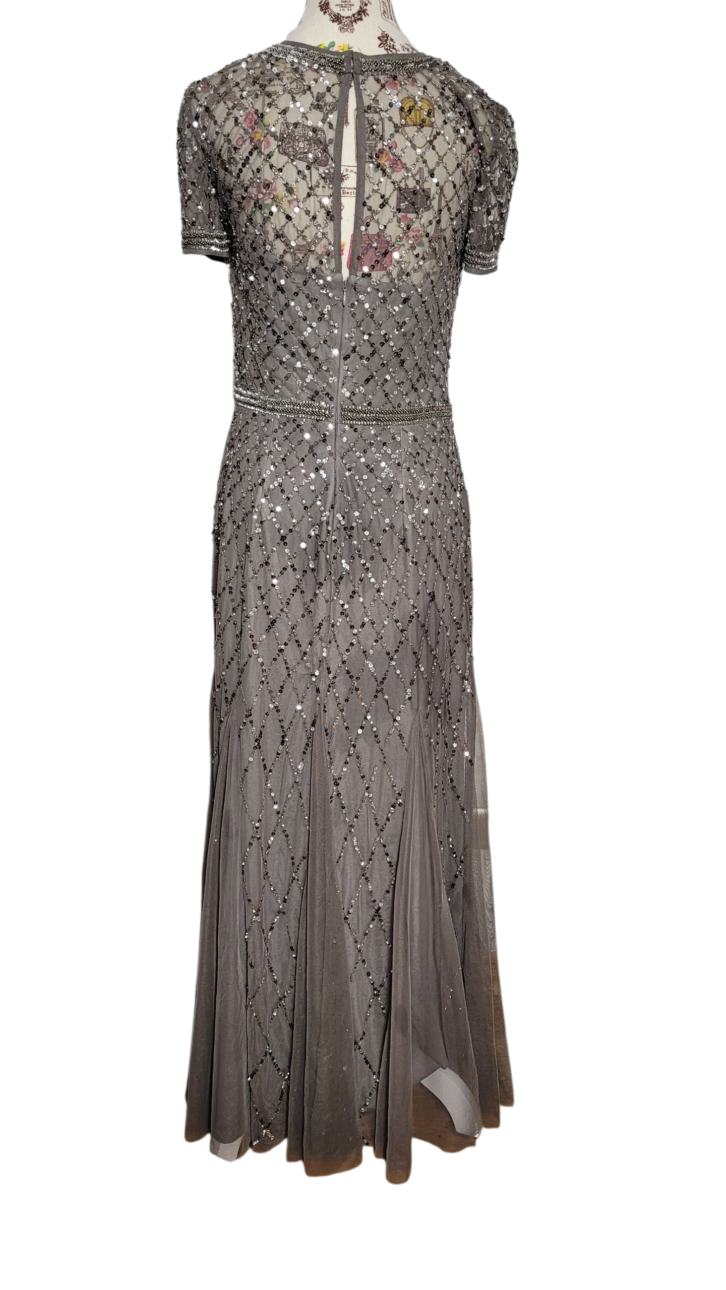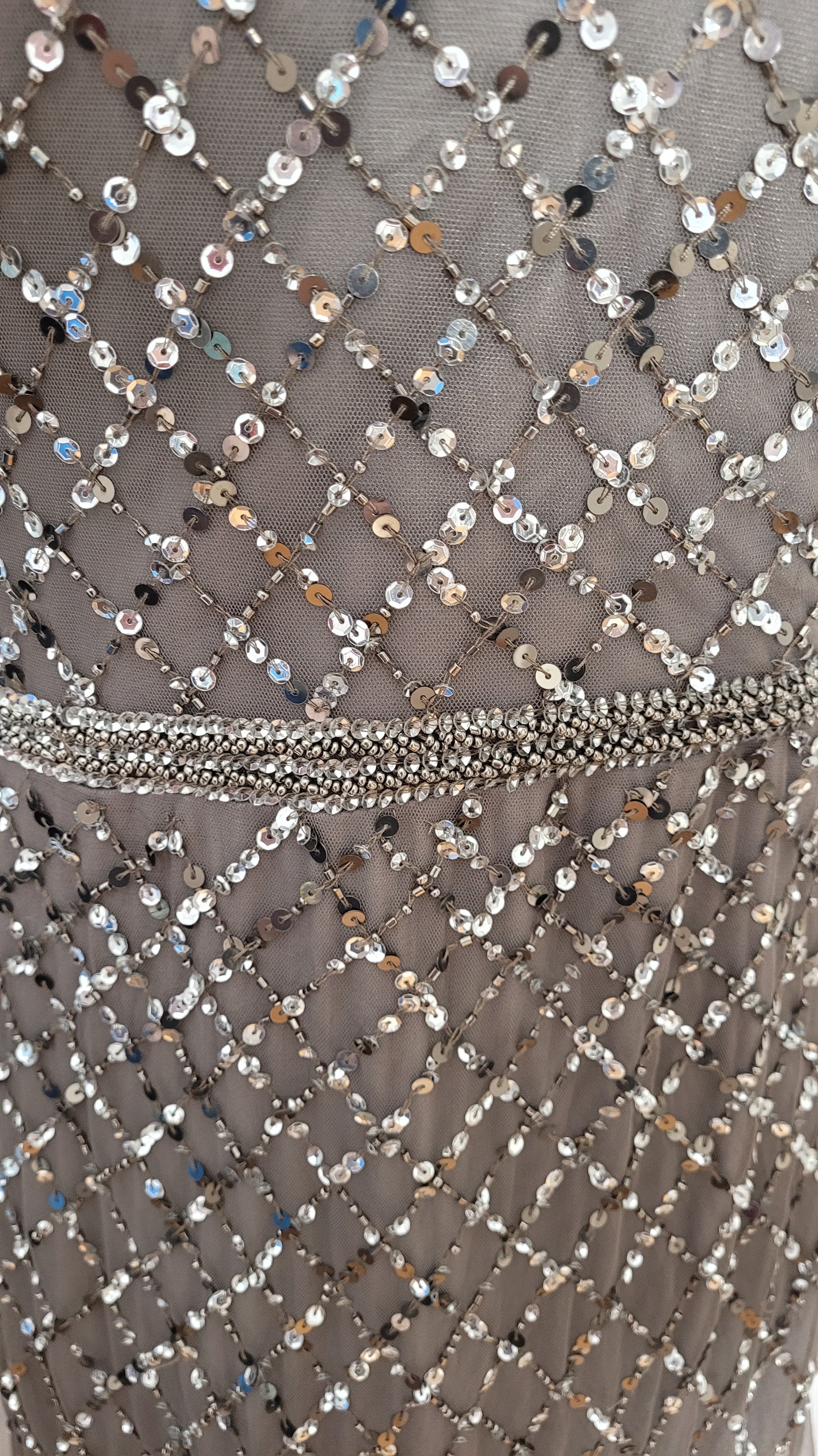 Hermoso vestido gris con lentejuelas plateadas en talla M .